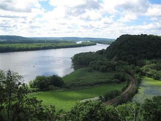 Wednesday, we took the southern route from I-90 to Dubuque and back. This was a bit over 200 miles round trip. We took the MN/IA side down and the Wisconsin side back. As was the case with our tour on Monday, the scenery was beautiful! The weather was bright and sunny, giving us a contrast to Monday. One of our stops was at the Effigy Mounds National Monument in IA. The history of these mounds is not well documented, but it appears that the Indians created them as burial grounds. Some of the mounds are huge in breath and width. Some are shaped like the profile of an animal. We took a fairly steep hike in the woods (about two miles round trip) to get to the Eagle Rock overlook. It was much more picturesque that the photo shows.