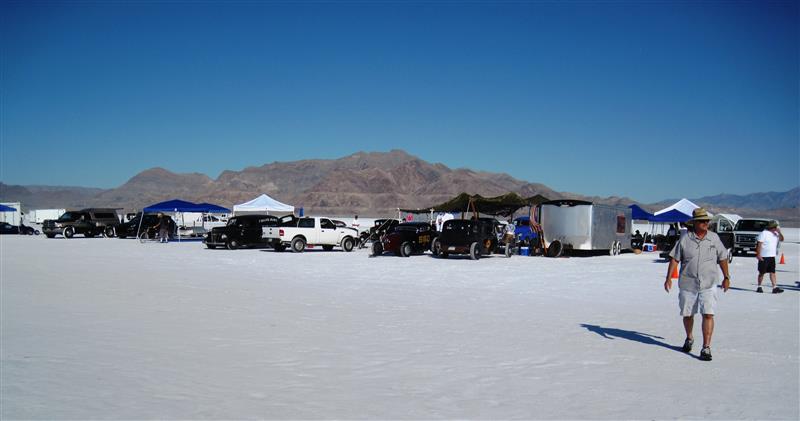 Saturday, I drove to Bonneville for one day of the 2013 Speed Week event.  I have attended several  Bonneville Speed Week events, beginning about 1990.  It is an amazing, unique event.  You see race cars of every shape, size and description.  The Bonneville Salt Flats and the surround area is awesome   and very picturesque.  The photo below shows the low level mountains in the background and a typical pit scene.  You will note all the old style cars.  There is always a large number of old style “hot rods” – many driven by some old men {grin}.   The second photo shows our rented car with the pits in the background.