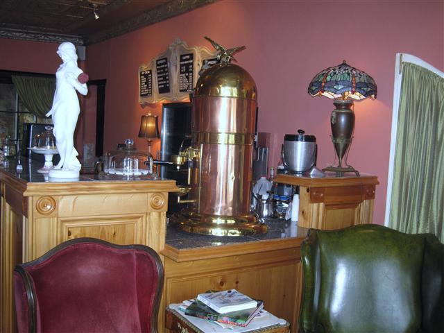 Our next stop was Alma, WI.  That is a site of one of many dams/locks along the route.  Most of the dams are very shallow and are probably used for flood control.  The locks have an elevation change of less that 10 feet from the looks of it.  When we got to Alma, we saw a tugboat and 6 barges approaching the locks.  It was taking some time, so we decided to look around Alma (very small town) for a coffee house.  Well, not only did we find one, but it looked like it was straight out of the ’30s or ’40s.  As you can see in the picture, they use a very old espresso machine.  Not only that, they had great pie for Pat and I had a great scone.  By the time we got done, the tug and barges were in the lock.  I have attached a picture of them leaving.  I have also attached a photo of the main street of Alma.  It is very typical of the small towns all along the river.