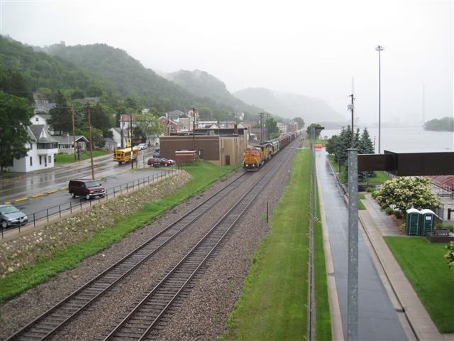 Monday (6/14) we took a northern tour on the Great River Road.  We drove up the Minnesota side from the I-90 exit to Wabasha, MN and then crossed the river and came down the Wisconsin side.  That whole valley is so beautiful!  We stopped in Winona, MN for lunch in a great bar/cafe right on the Mississippi.  They are famous for their grilled cheese sandwiches.  Pat ordered the grilled cheese and I ordered a barbecue sandwich. We split the sandwiches and they were great.
