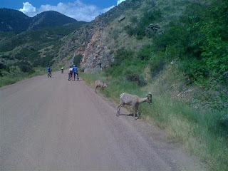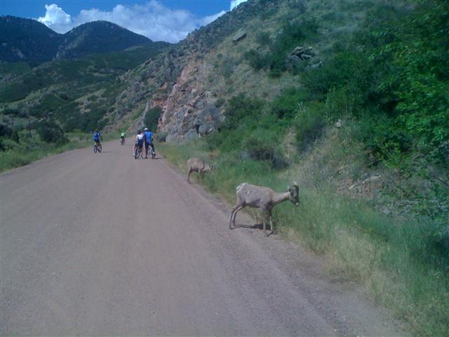 I want to digress and talk about a fun day we had on Saturday. The family got together for a celebration of Pat’s birthday and Father’s day (we were out of town for both). In the morning, Pat had a Stampin’ UP! party so Kelly, Damon and I rode our bicycle up Waterton Canyon – close to their house. This is a very scenic ride along the South Platte river ending up at the Strontia Springs Dam. The ride is 6.5 miles each way. The route up the river is a steady, moderate climb, which makes riding back a piece of cake. We got to see quite a bit of wildlife, but the best experience was seeing very young mountain sheep up on the rocks very close to the road. I have included pictures of the mothers and the lambs.